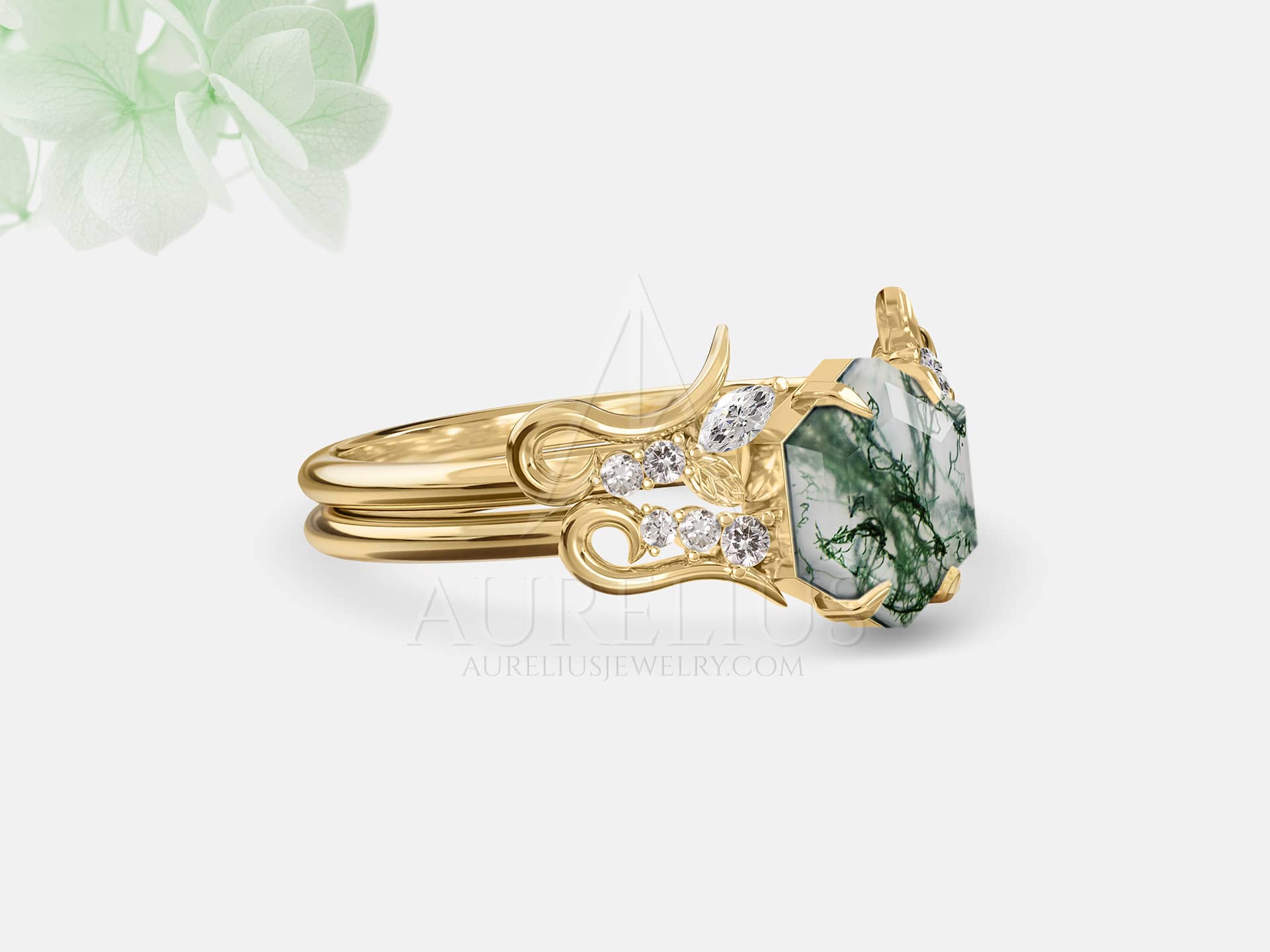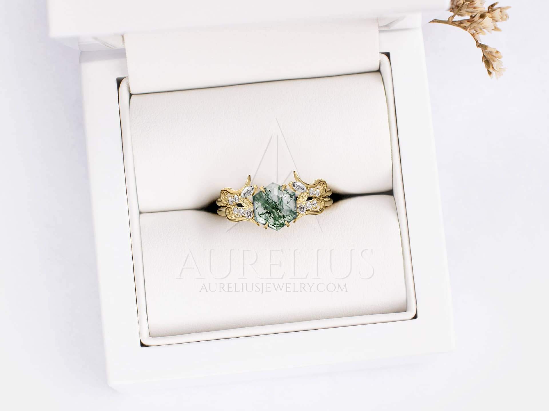 Absolutely beautiful ring set! I just received it and it looks to be well made and exactly what I was expecting! I love the dainty gold leaves and the pattern in the hexagon moss agate stone.I am really happy that I choose to go with this shop.